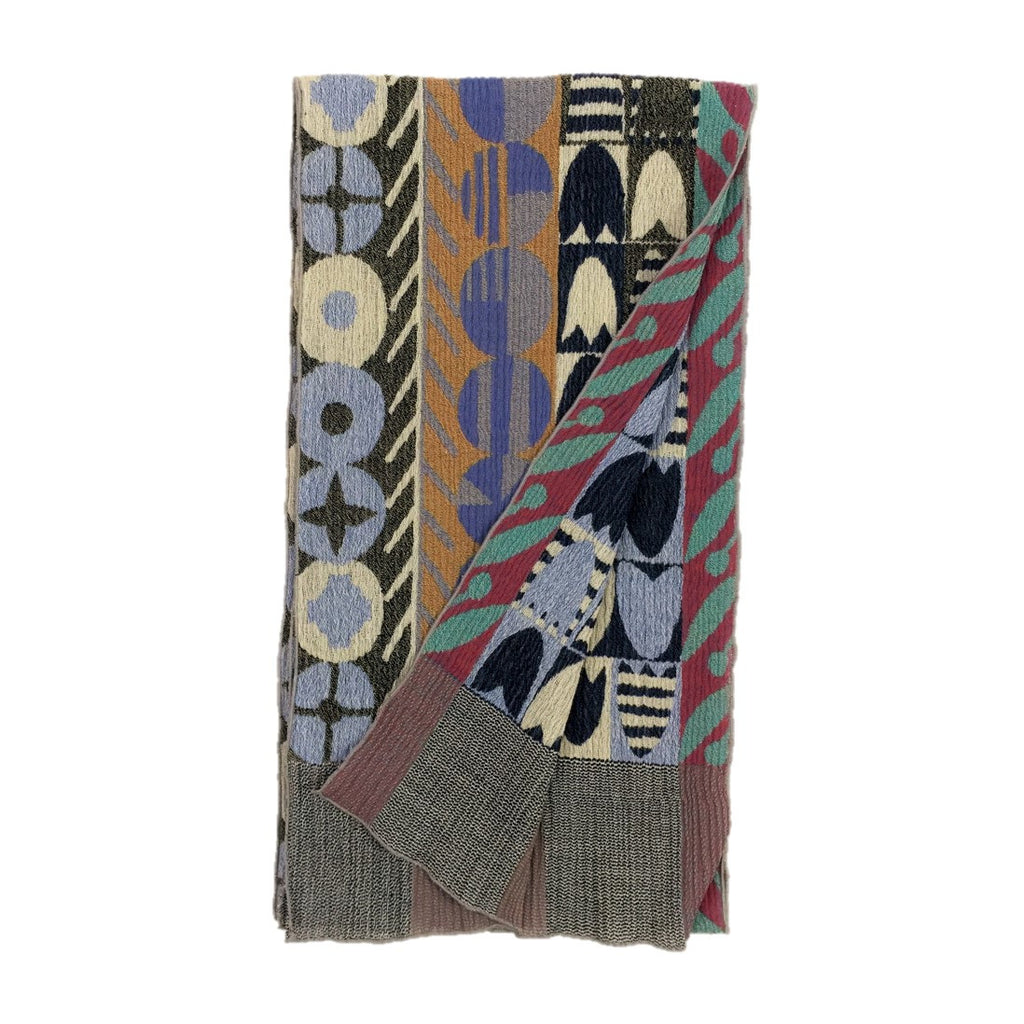 This double-weave shawl features a tulip design in a comples layering of colors. Uniformly long, fine, high-quality Merino wool is as heat retentive as it is soft on the skin.