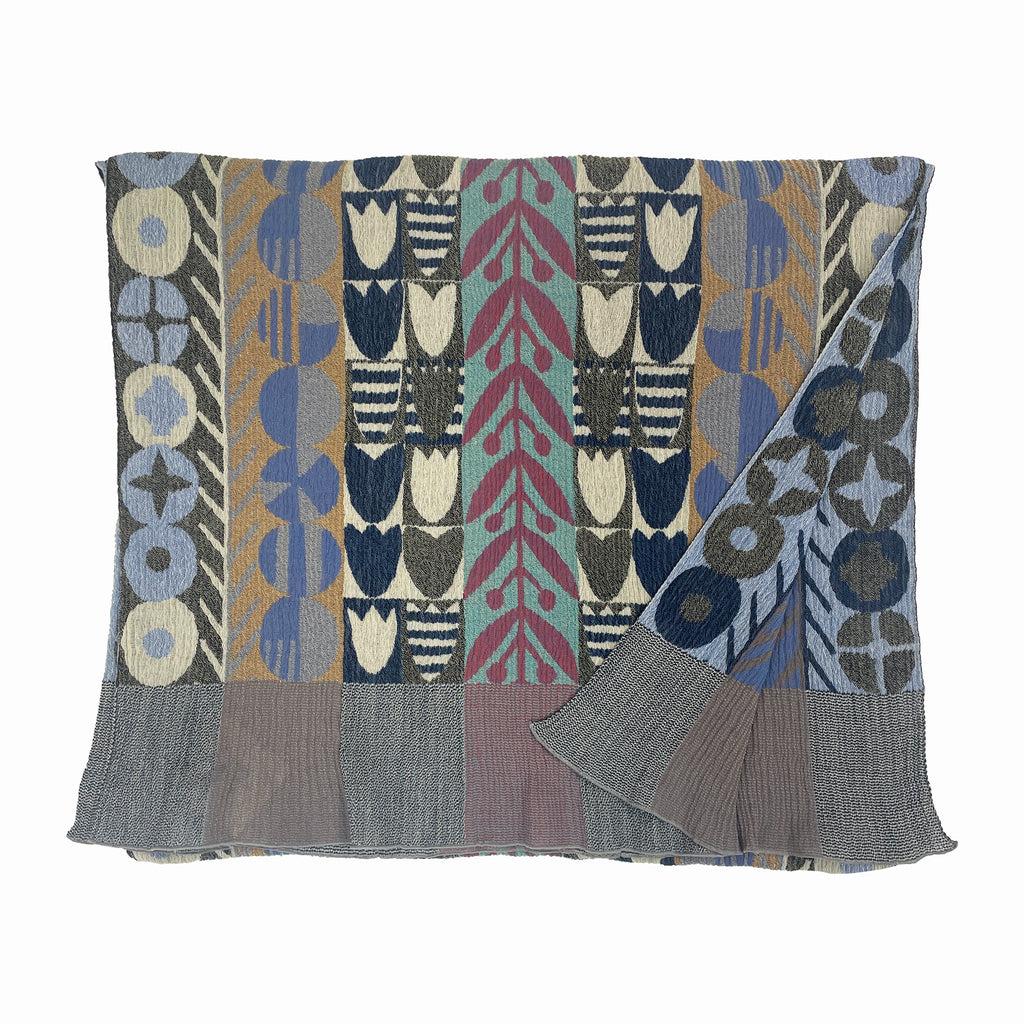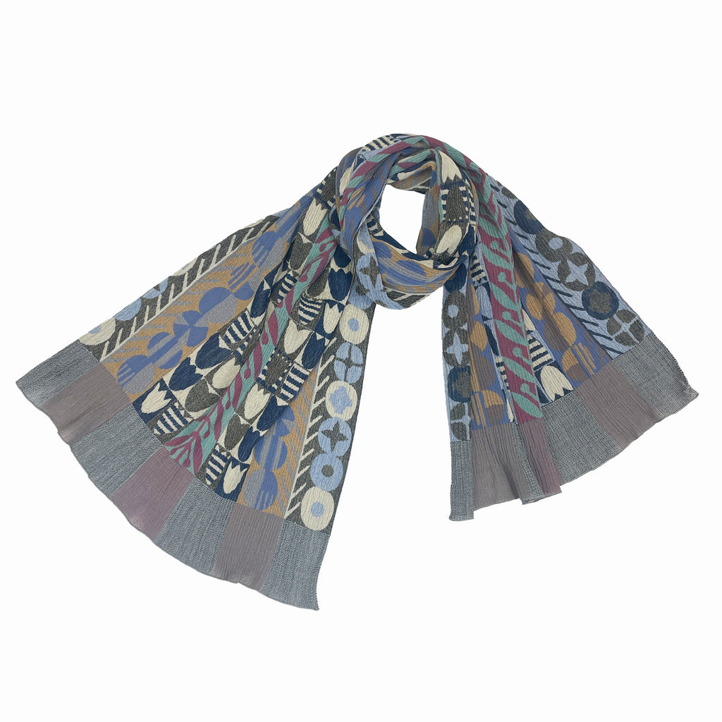NUNO weaves this shawl on a special loom traditionally used for fukuro obi pocketed sashes out of uniformly long, fine, high-quality Merino wool, which is as heat retentive as it is soft on the skin. Sundance features a multiple tulip design in a complex layering of colors.